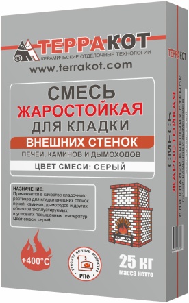 Смесь жаростойкая для кладки внешних стенок печей, каминов и дымоходов «Терракот» — готовый состав для кладки и ремонта внешних стенок дымоходных систем, уличных барбекю, мангалов, коптилен, грилей, а также лицевых контуров внутридомовых печей и каминов. Смесь может применяться для восстановления кладочных швов. Жаростойкость смеси составляет 400°С.