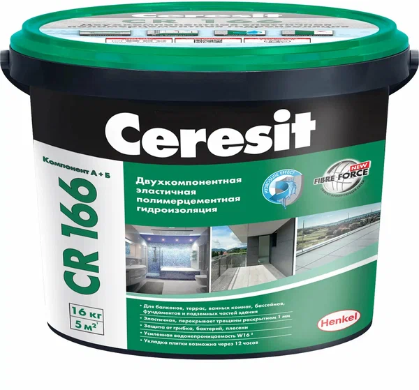 Ceresit CR 166 - двухкомпонентная гидроизоляционная масса с эластичными свойствами. Обеспечивает надежную защиту от протеканий и влаги на различных поверхностях, таких как крыши, фундаменты и ванной комнаты.